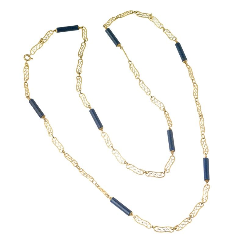 LUNGA COLLANA A CATENA CON LAPISLAZZULI in oro giallo 18kt, composta da una serie di maglie traforate e concatenate, alternate a elementi cilindrici in lapislazzuli, punzoni 750 e del fabbricante, lungh. cm 97, gr. 32