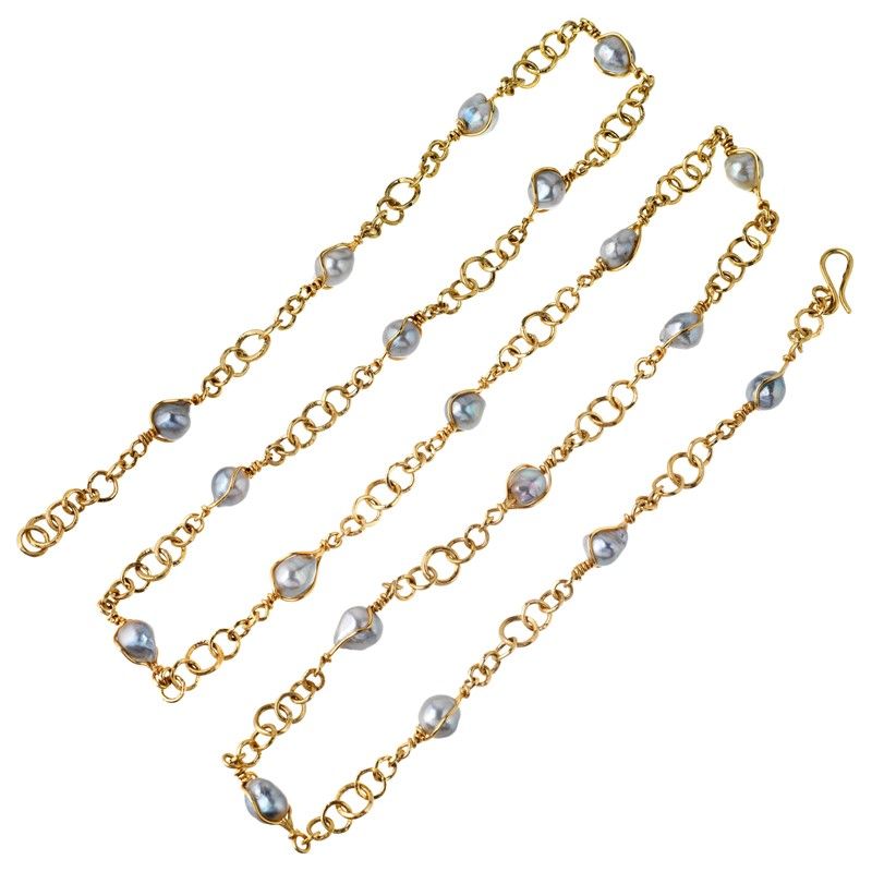 in oro giallo 18kt, composta da una serie di anelli concatenati e perle barocche, punzoni 750 e del fabbricante, lungh. cm 108, gr. 85