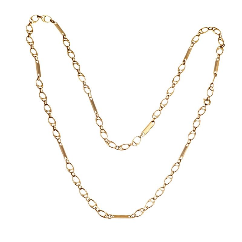 in oro giallo 18kt, composta da una serie di maglie concatenate, punzoni 750 e del fabbricante, lungh. cm 86, gr. 37
