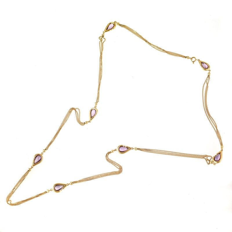 in oro giallo 18kt, a tre fili di catenine unite e alternate a distanziali con gocce di ametiste, punzone 750, lungh. cm 80, gr. 22