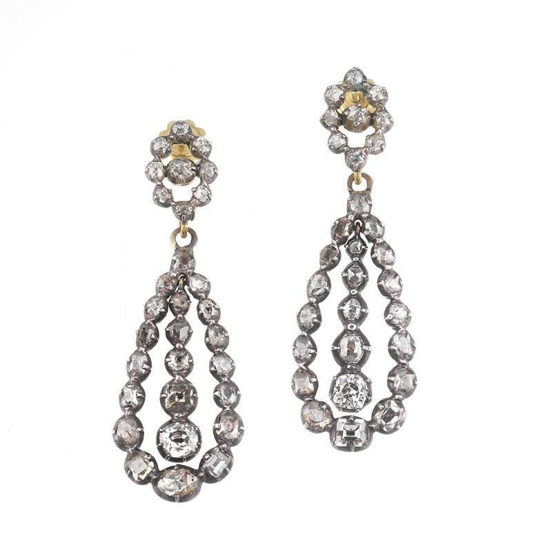 in argento, ciascuno composto da due elementi concatenati, impreziositi da diamanti taglio vecchio per ct 3 circa, chiusura a vite, lungh. cm 5, gr. 13 complessivi