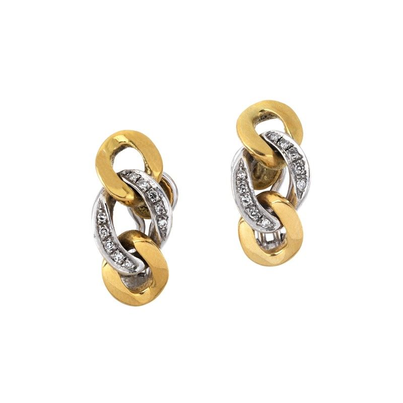in oro giallo e bianco 18kt, realizzati a maglia groumette, impreziositi al centro da diamanti taglio huit huit per ct 0.20 circa, punzoni 750 e del fabbricante, chiusura a clip con perno, dim. cm 1x2,5, gr. 16 complessivi