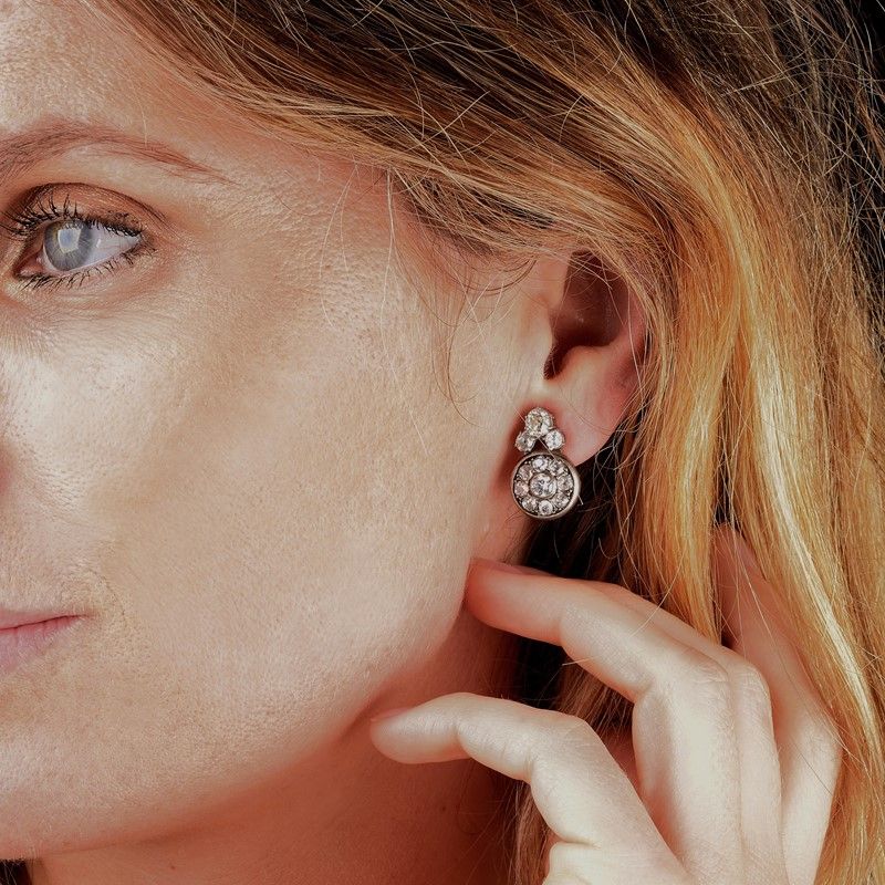 in argento, impreziositi da diamanti taglio antico per ct 1.80 circa, chiusura a clip, dim. cm 1x2 circa, gr. 11 complessivi