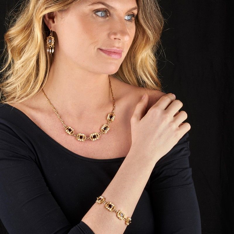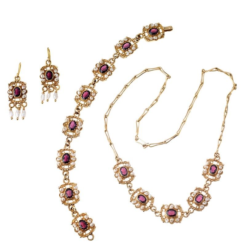 PEARL AND GARNET FLORAL PARURE IN 18KT YELLOW GOLD