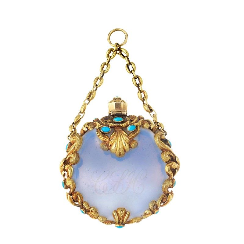 in oro a basso titolo, composto da catena e flacone portaprofumo in materiale vitreo raffigurante delle iniziali, cinto da tralci e turchesi, dim. cm 5x9 circa, gr. 24