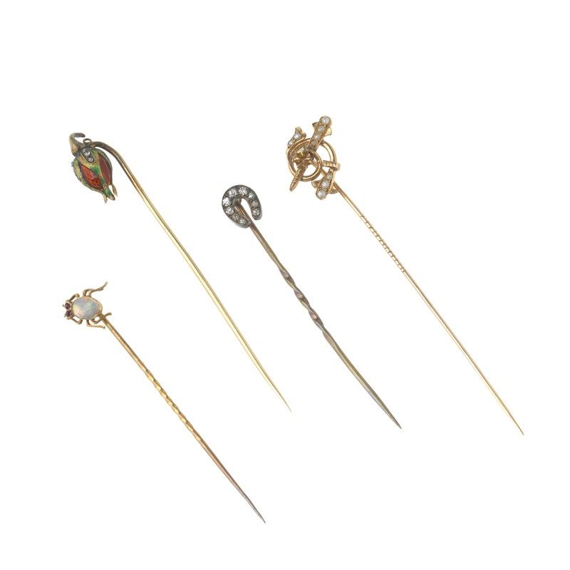 di cui uno in oro giallo 18kt, con un fiore decorato in smalti (difetti) e rose di diamante, punzoni francesi, lungh. cm 7, gr. 3, accompagnato da due spilli in oro a basso titolo e una spilla in metallo a forma di ferro di cavallo, lungh. cm 7,5 e 5,5, gr. 9 complessivi
