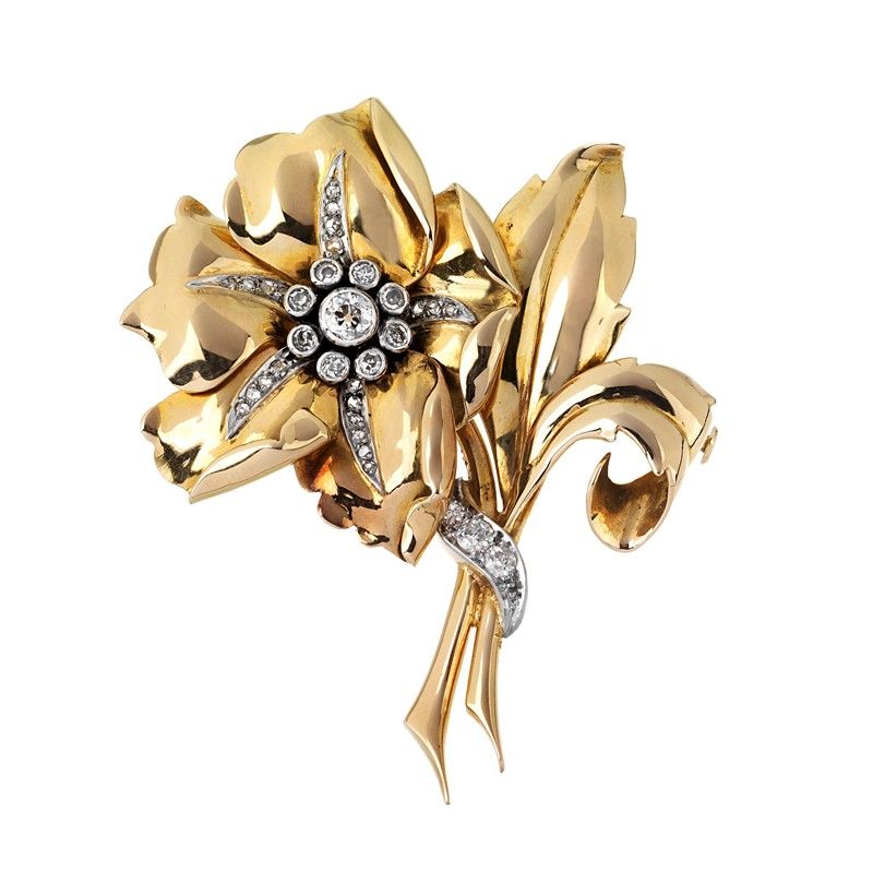 DIAMOND FLOWER SHAPED BROOCH IN 18KT TWO TONE GOLD