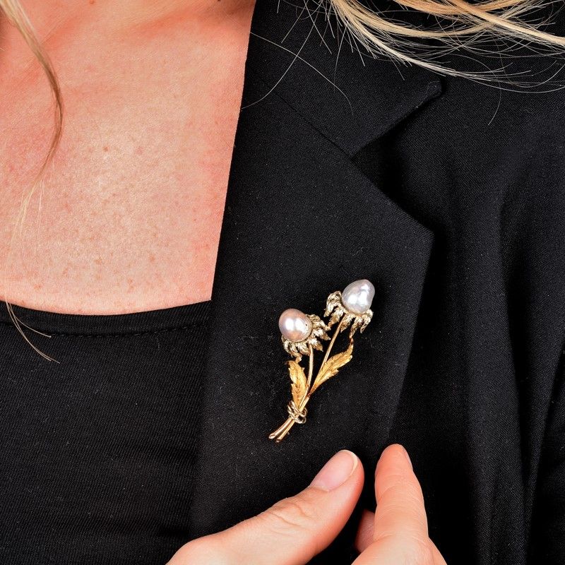 PEARL FLOWERING BRANCH-SHAPED BROOCH IN 18KT TWO TONE GOLD