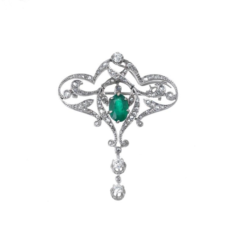 in platino, impreziosita da uno smeraldo centrale di ct 1.60 circa circondato da diamanti taglio vecchio e a rosa per ct 0.50 circa, dim. cm 4x5, gr. 13