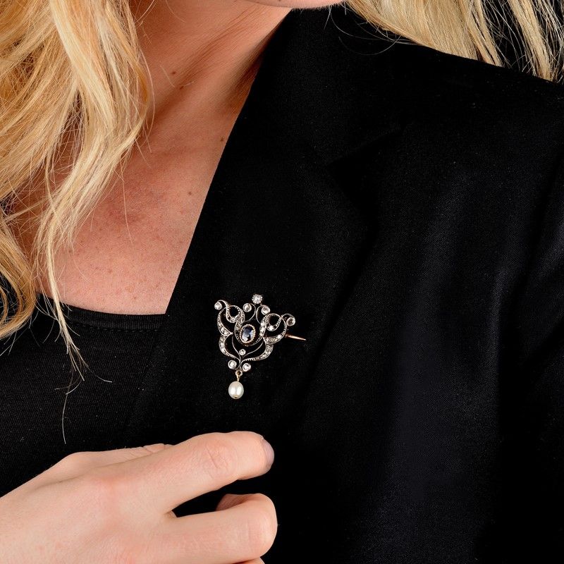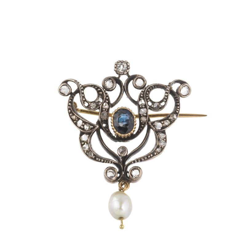 SAPPHIRE PEARL AND DIAMOND BROOCH IN GOLD AND SILVER