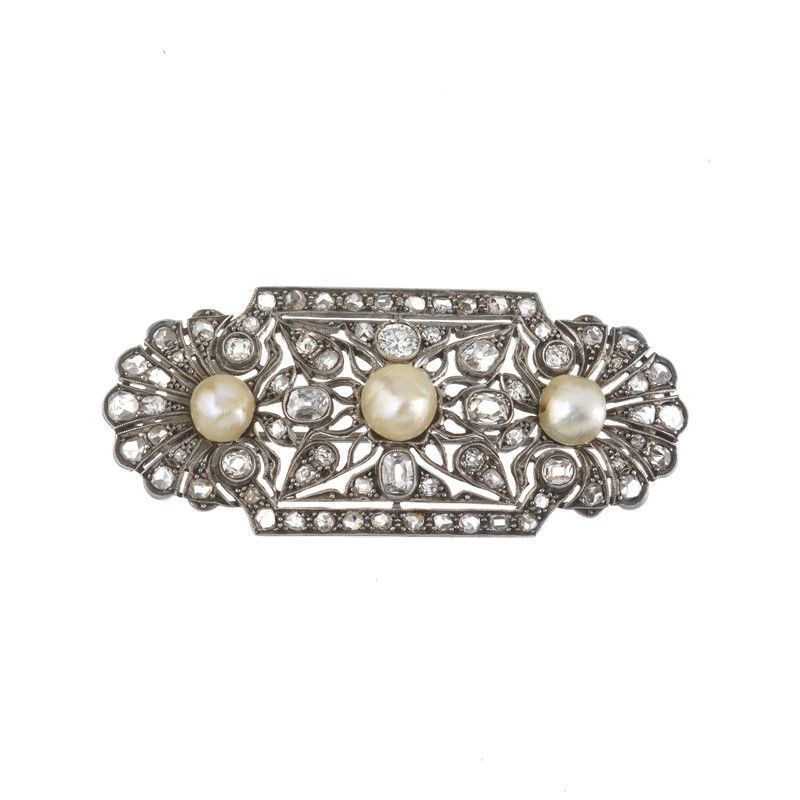 in oro bianco 18kt, impreziosita da una perla centrale di mm 7 circa, due perle laterali di mm 5 circa e diamanti taglio brillante, antico e a rosa per ct 2 circa, dim. cm 6x2,5, gr. 18