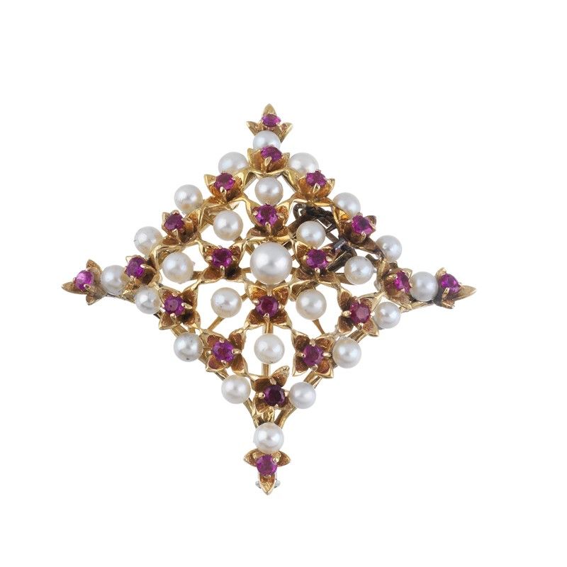 in oro giallo 18kt, di forma romboidale e traforata, impreziosita da perle di mm 4-3 circa e rubini taglio rotondo per ct 1.10 circa, punzoni 750 e del fabbricante, dim. cm 4,5x4,5, gr. 13