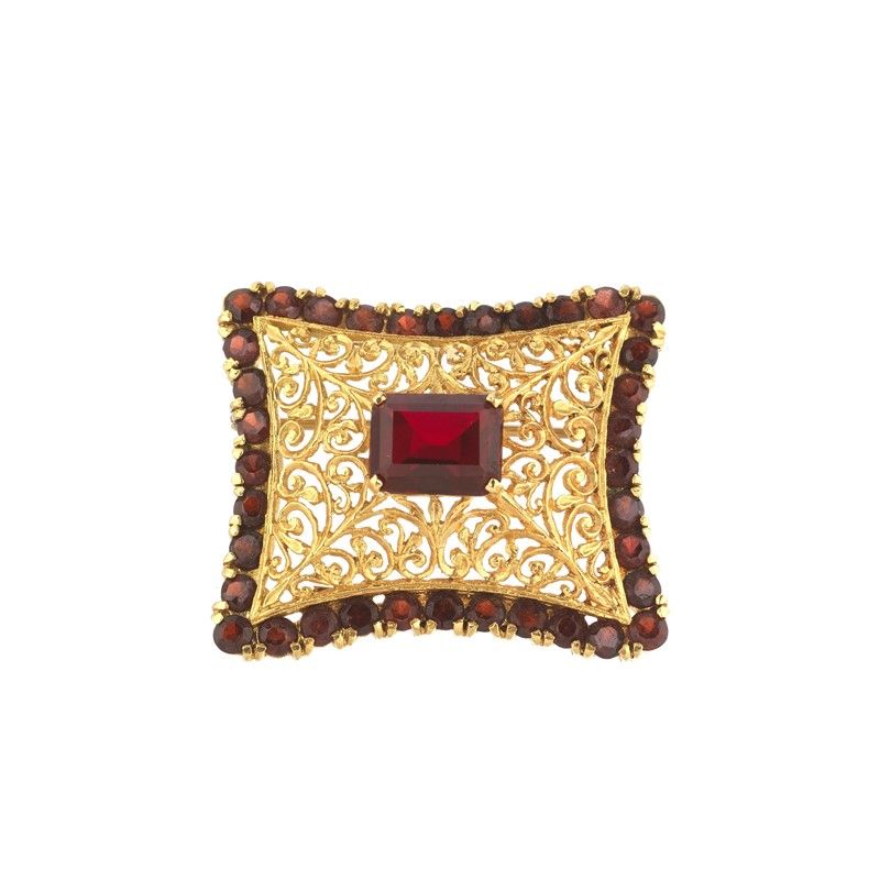 SPILLA TRAFORATA CON PIETRA SINTETICA E GRANATI in oro giallo 18kt, raffigurante un motivo a tralcio fiorito, circondata da una fila di granati taglio rotondo, con al centro una pietra sintetica taglio ottagonale, punzoni 750 e del fabbricante, dim. cm 3x3 circa, gr. 13
