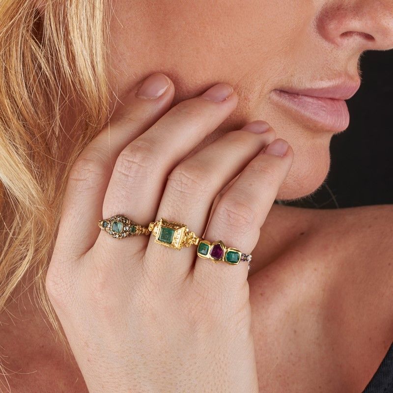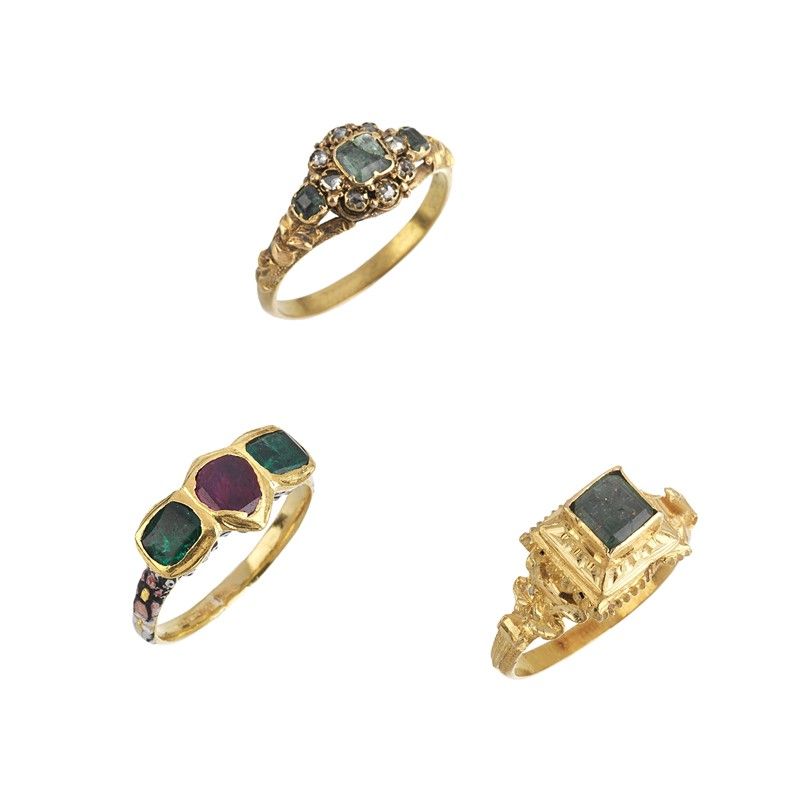 di cui due in oro giallo 18kt, impreziositi da smeraldi, un rubino e rose di diamante, mis. 13/53, gr. 7, accompagnati da un terzo anello in oro 9kt, gr. 2, mis. 16/56, gr. 10 complessivi