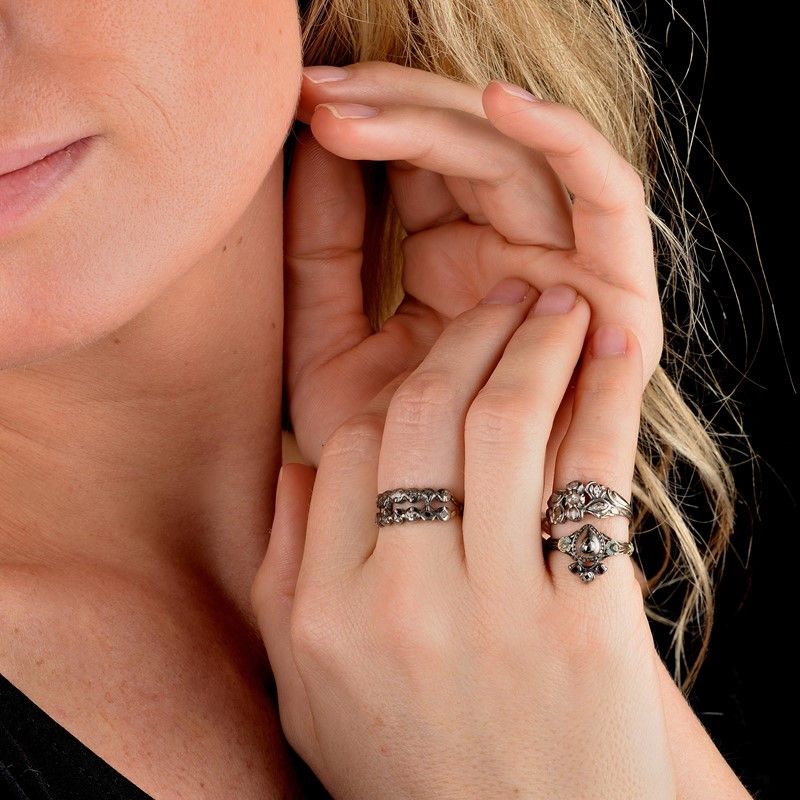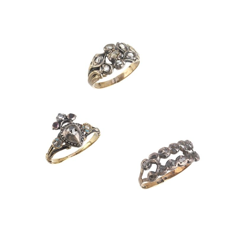 in oro e argento, impreziositi da rose di diamante, mis. 10/50, 11/51 e 17/57, gr. 7 complessivi