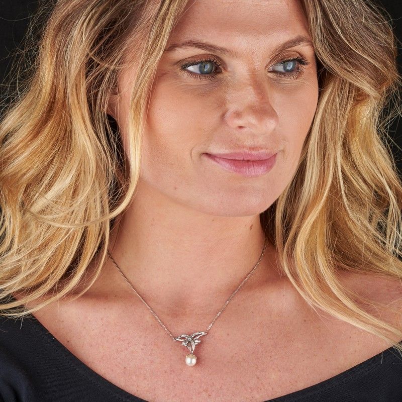 UNOAERRE COLLANA CON PERLA E DIAMANTI in oro bianco 18kt, con pendente impreziosito da una perla di mm 7 circa e diamanti taglio huit huit, punzoni 750 e del fabbricante "1 AR", lungh. cm 41, gr. 5