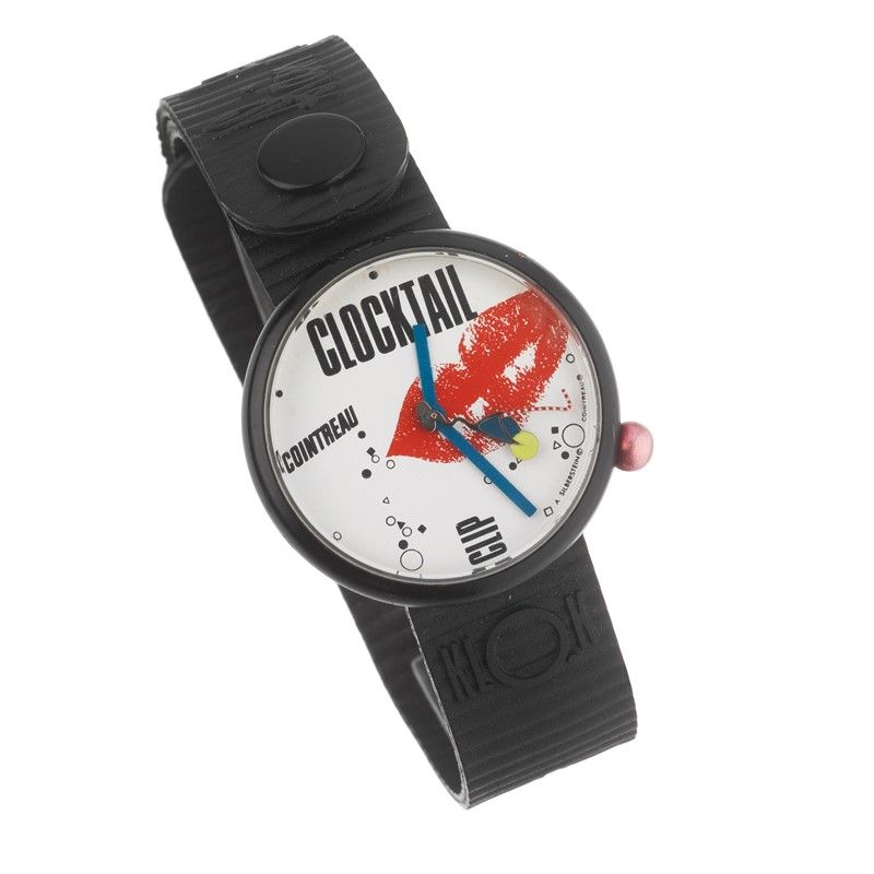 ALAIN SILBERSTEIN "CLOCKTAIL" cassa in plastica nera, fondello in metallo, corona a sfera, quadrante bianco recante immagine di bocca, grafica nera, lancette blu e lancetta dei secondi raffigurante bicchiere da cocktail, movimento al quarzo, cinturino originale in gomma nera con chiusura a pulsante, vetro plastica. Diam mm 32