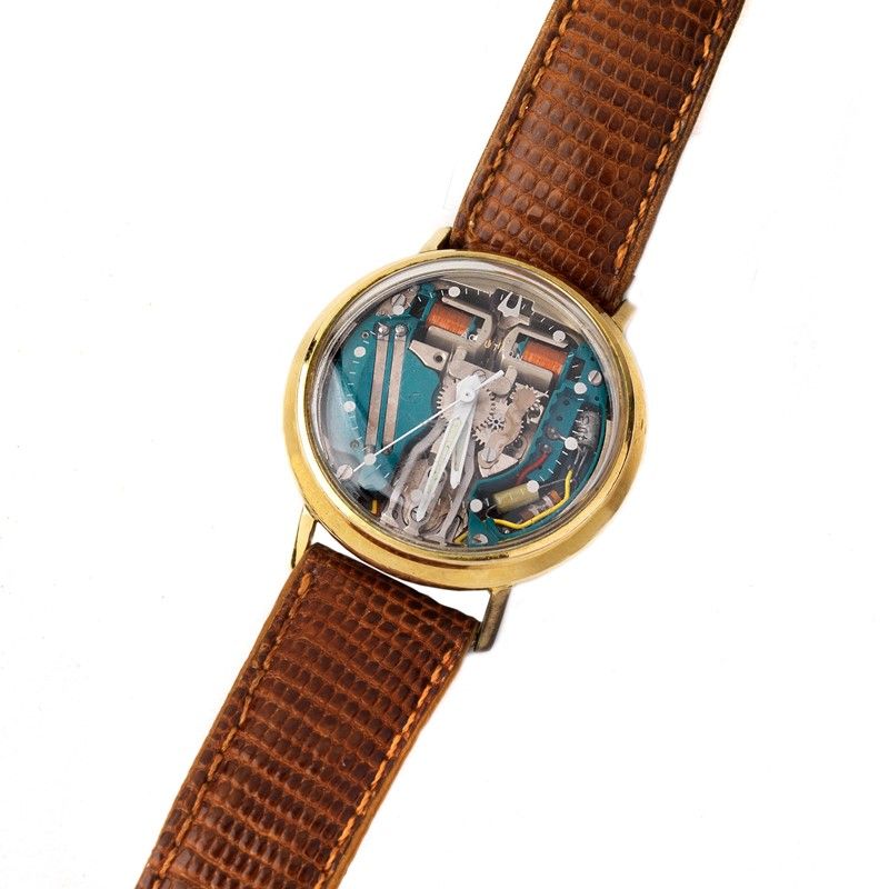 BULOVA ACCUTRON OROLOGIO DA POLSO cassa placcata in oro, fondello a vite con corona di rimessa dell'ora, quadrante con movimento a vista, movimento diapason modificato per pile di ultima generazione, cinturino in pelle marrone con fibbia in metallo non originali, vetro plastica bombato con indici e logo stampati. Diam. mm 33