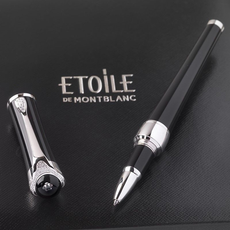 MONTBLANC ETOILE PRECIEUSE PENNA ROLLERBALL fusto in resina nera, dettagli di rifinitura in metallo argentato, cappuccio e fermaglio impreziositi da file di piccoli brillantini, sulla sommità del cappuccio un diamante sospeso a forma stella simbolo della maison, firmata Montblanc, caricamento a cartuccia, lungh. cm 14,5. Corredata di scatola, controscatola e libretto.