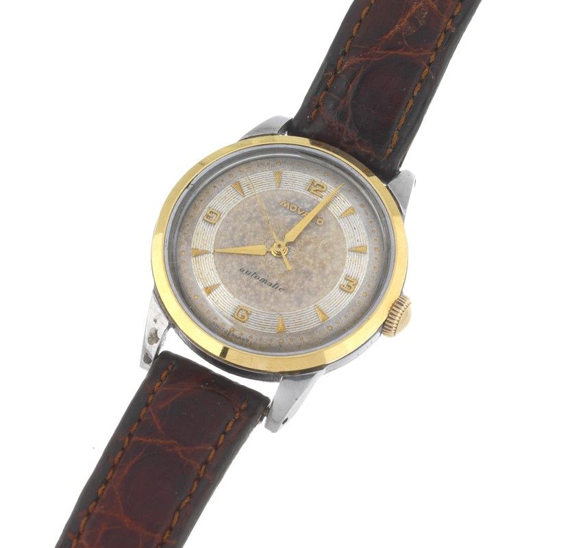 MOVADO OROLOGIO AUTOMATICO cassa in metallo, fondello serrato a vite, quadrante argenté a cerchi concentrici, grafica nera, numeri arabi e indici applicati, movimento a carica automatica cal C.221A, cinturino in pelle bordeaux con fibbia in metallo non originali, vetro plastica. Diam. mm 33