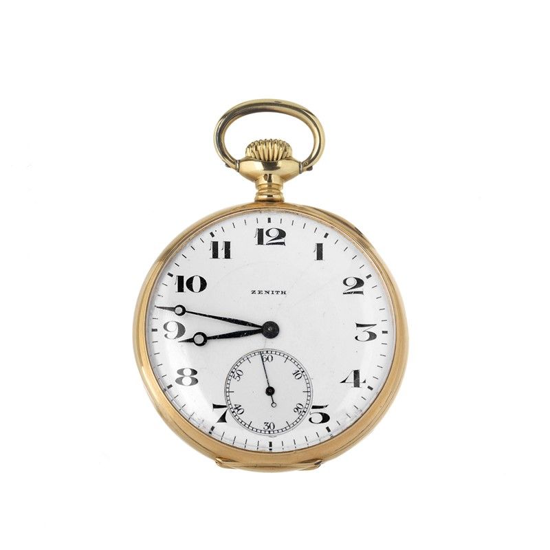ZENITH OROLOGIO DA TASCA N. 2033XX cassa in due parti in oro giallo 18kt, fondello liscio, quadrante bianco in porcellana (difetti), numeri arabi a smalto, lancette breguet, secondi a ore sei, movimento a carica manuale n. 2310087, gr. 73. Diam. mm 46