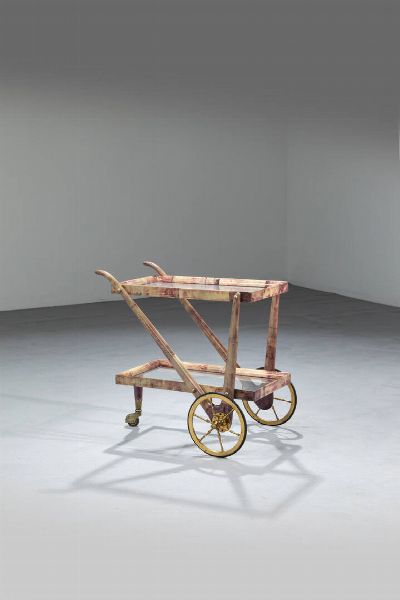 Carrello in legno foderato con pergamena invetriata piani a vassoio in vetro particolari [..]
