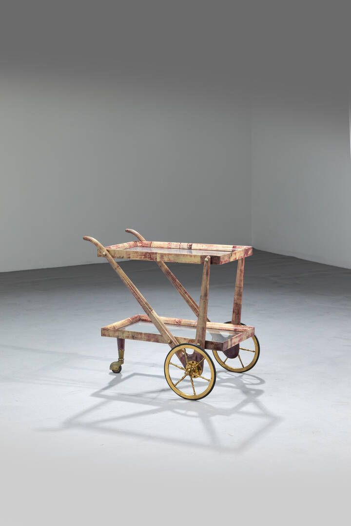 Carrello in legno foderato con pergamena invetriata piani a vassoio in vetro particolari in ottone. Anni '50 cm 65x65x42