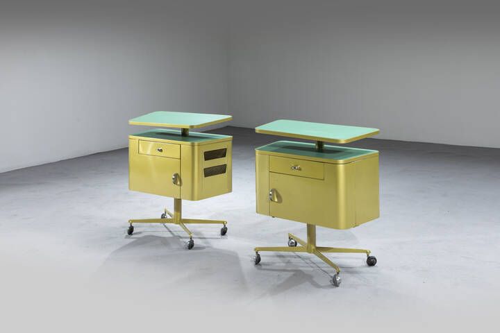 Metallo pressato verniciato piano rivestito in formica e bordo in alluminio ottonato. Prod. Officine Valsecchi anni '50 cm 76x65 5x35 Difetti