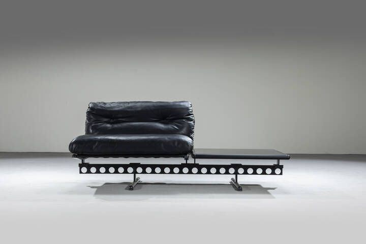 Divano con struttura e sostegni in metallo laccato rivestimento in pelle tavolino con struttura e sostegni in metallo laccato e piano in marmo . Prod. Frau anni '80 cm 80x190x83