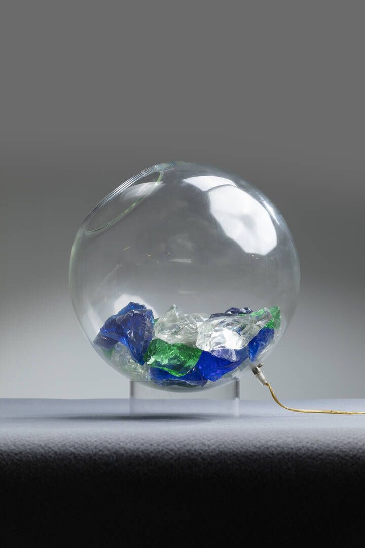Vetro soffiato lavorato a mano con cristalli colorati all'interno. Prod. Leucos anni '80 h cm 42x40x40 Piccole sbeccature