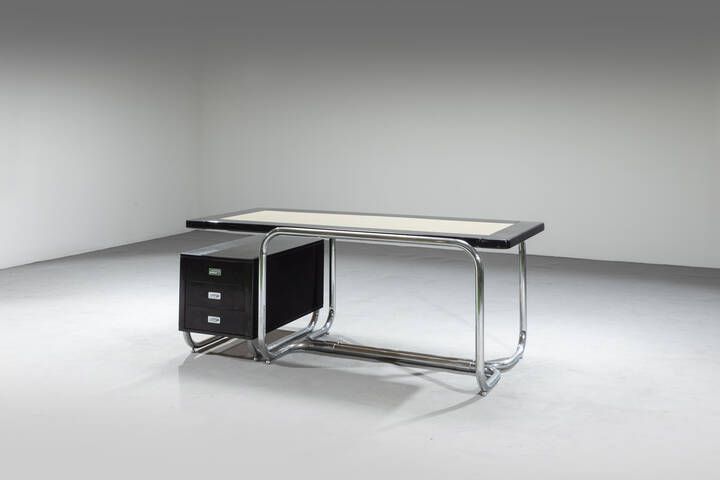 Struttura in metallo cromato piano in legno laccato. Anni '70 cm 79x194x90 Difetti