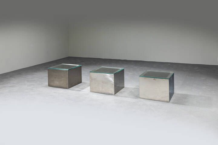 Struttura in acciaio spazzolato e piani in vetro. Anni '70 cm 35x45x45