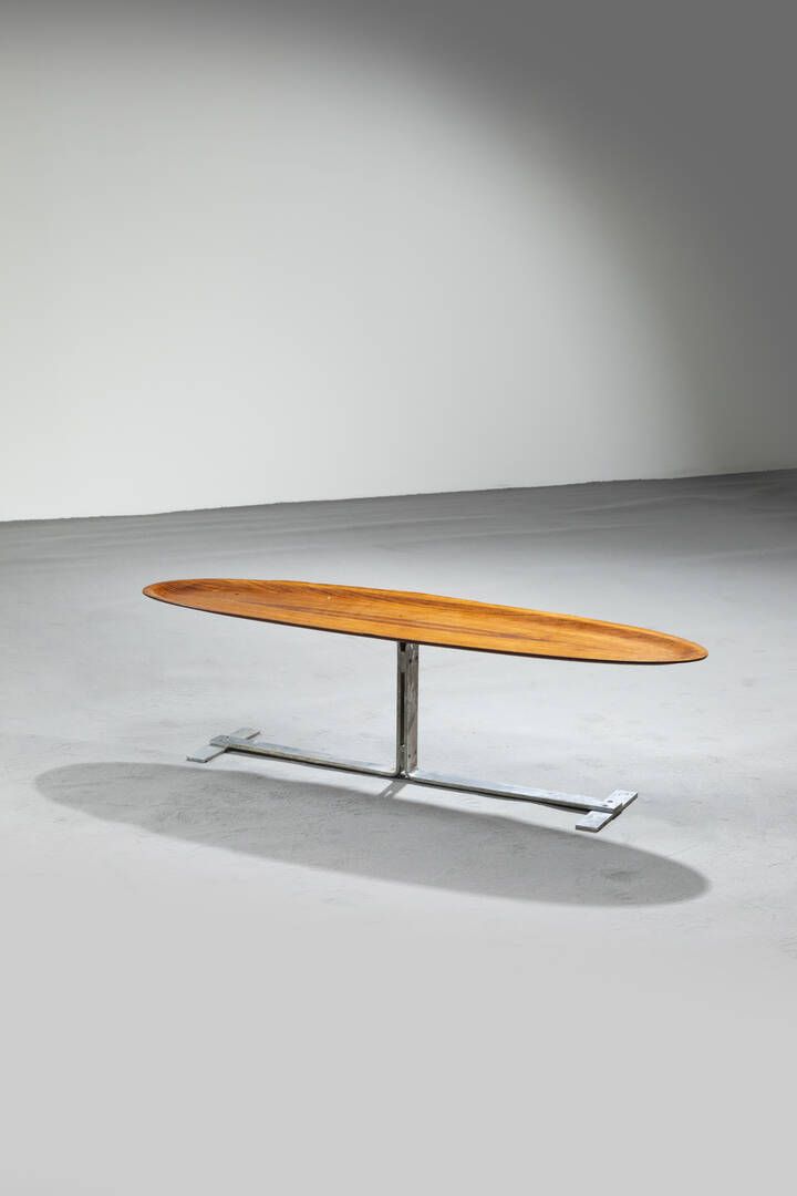 Tavolino con struttura in acciaio cromato piano in legno. Anni '60 cm 40x141x39 Difetti
