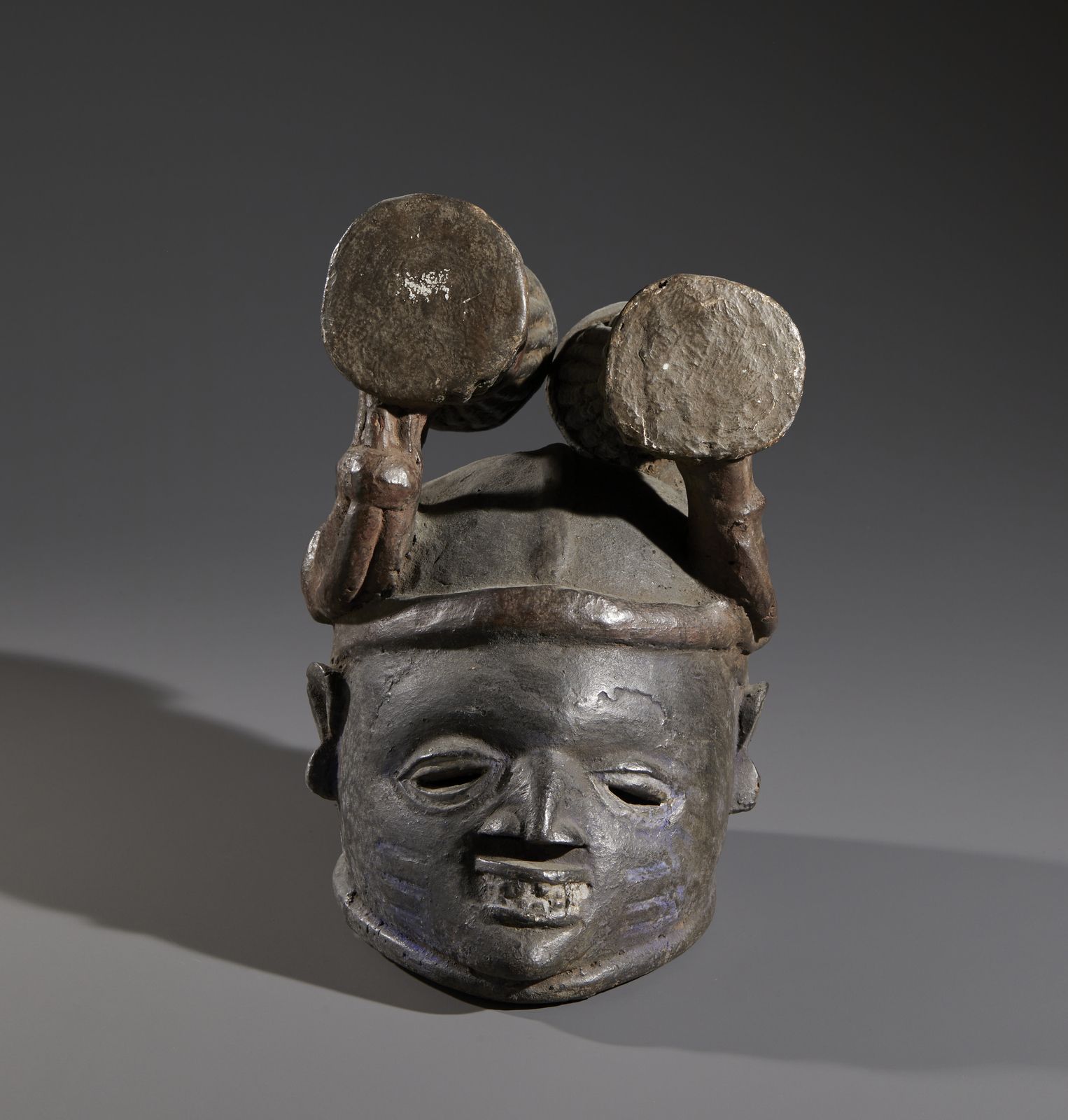 Nello stile di Maschera a casco in forma antropomorfa in legno a patina scura [..]