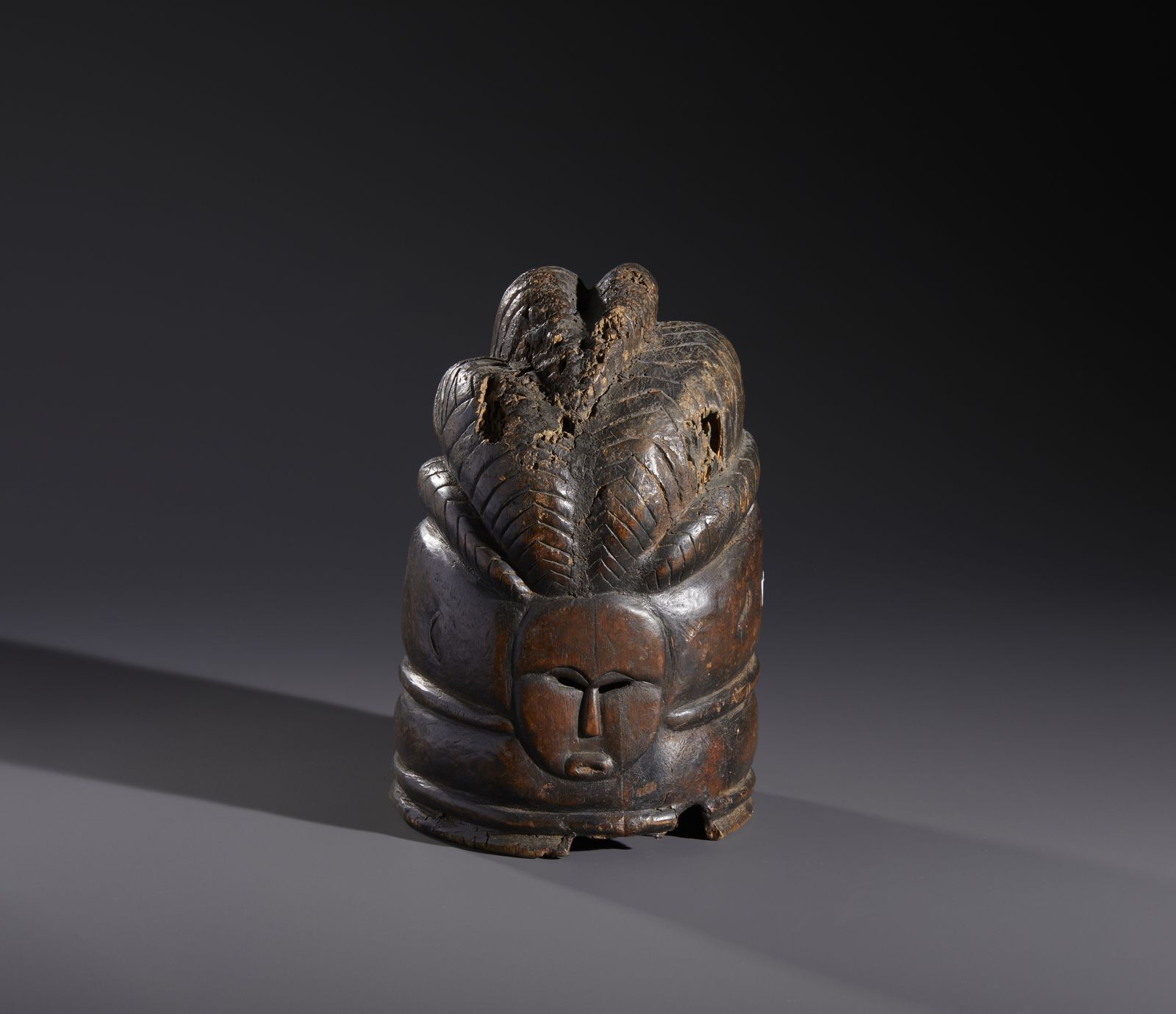Nello stile di Maschera a casco in legno duro a patina marronecon difetti e manc [..]