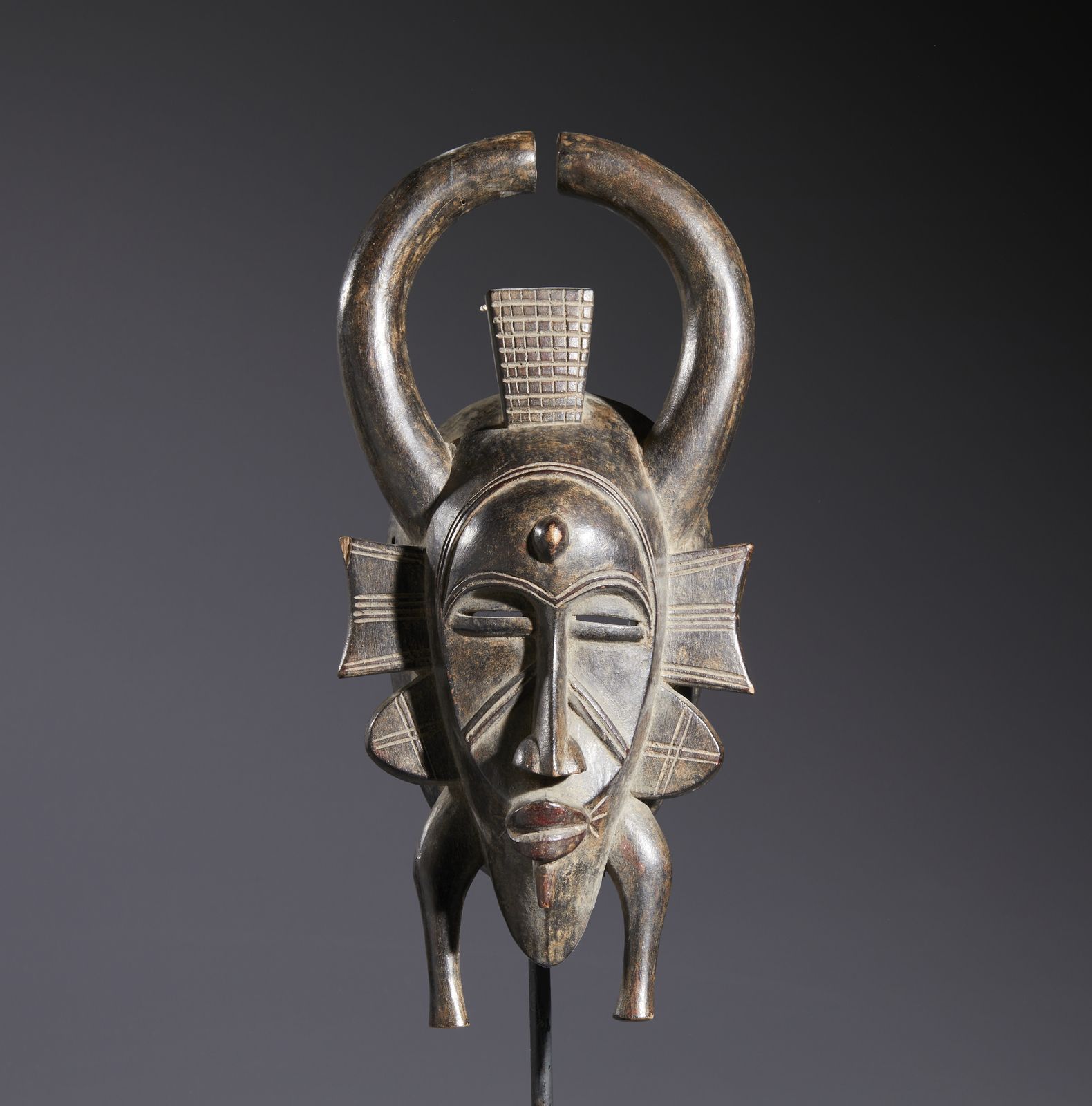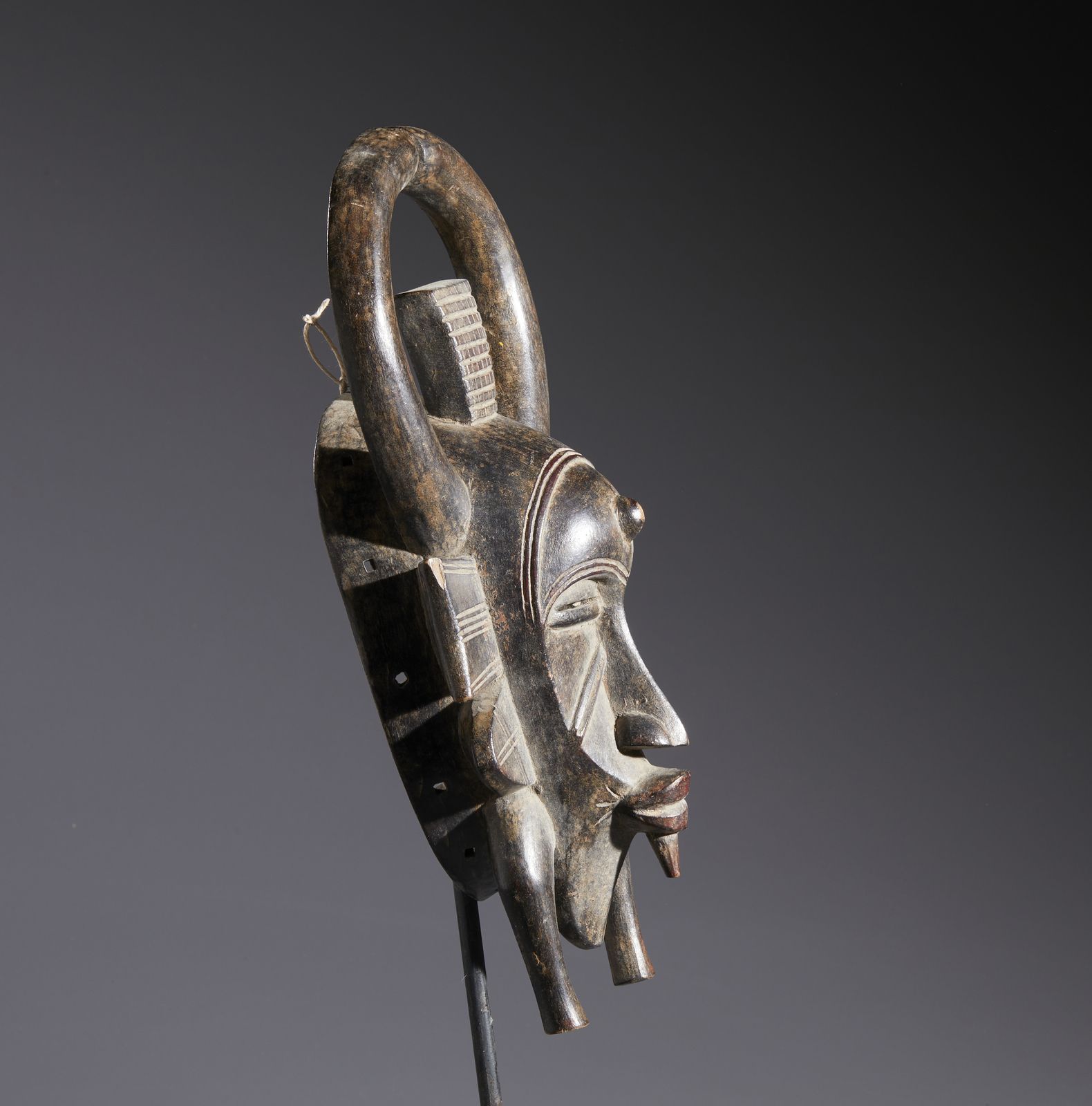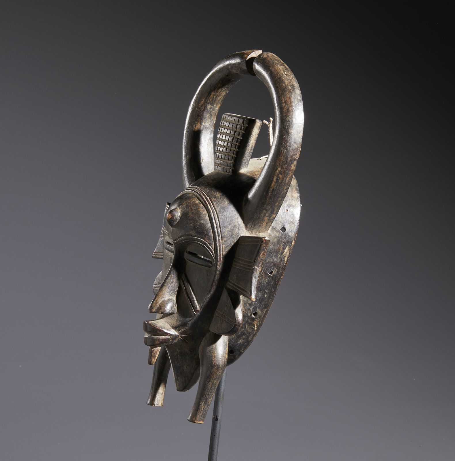 Nello stile di Maschera antropozoomorfa in legno duro a patina marrone