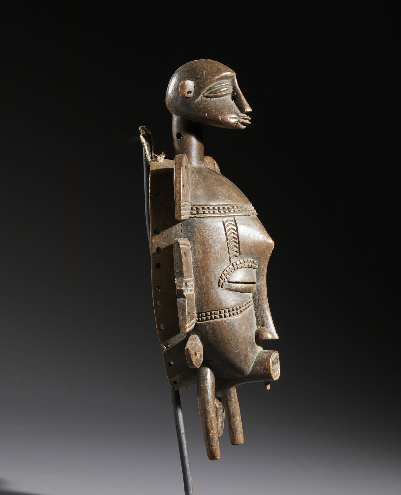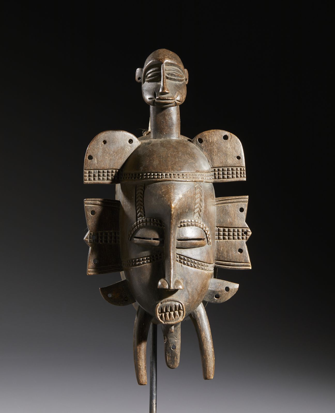 Nello stile di Maschera antropozoomorfa in legno duro a patina marrone chiaro
