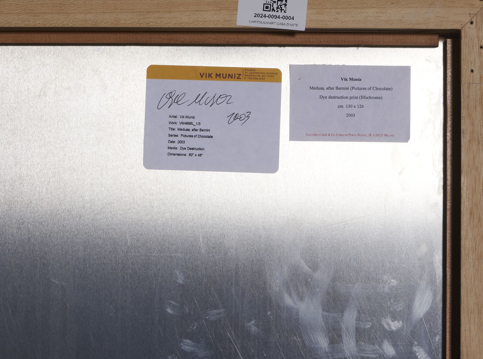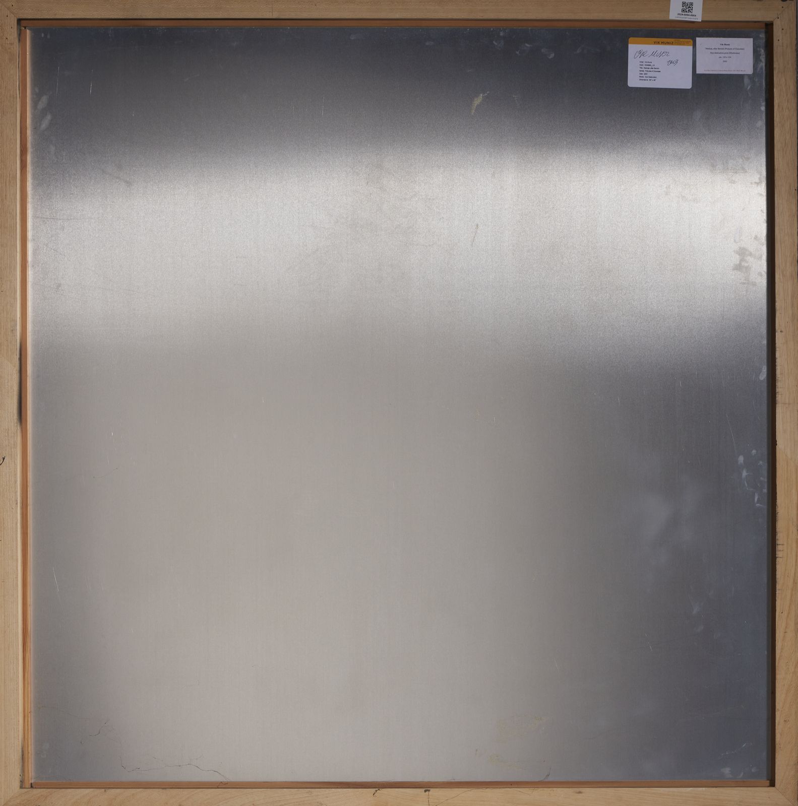 sul retro: etichetta Galleria Cardi & co, Milano ed etichetta Studio Vik Muniz, Brooklyn, con firma e data.L'opera ¸ registrata allo Studio Lexington Avenue - Brooklyn al n. VM4896L_1/3ESPOSIZIONE:Milano, Galleria Cardi, dal 21 aprile Š 19 luglio 2005. Vik Muniz.PROVENIENZA: Galleria Ciardi, MilanoCollezione privata, Firenze.