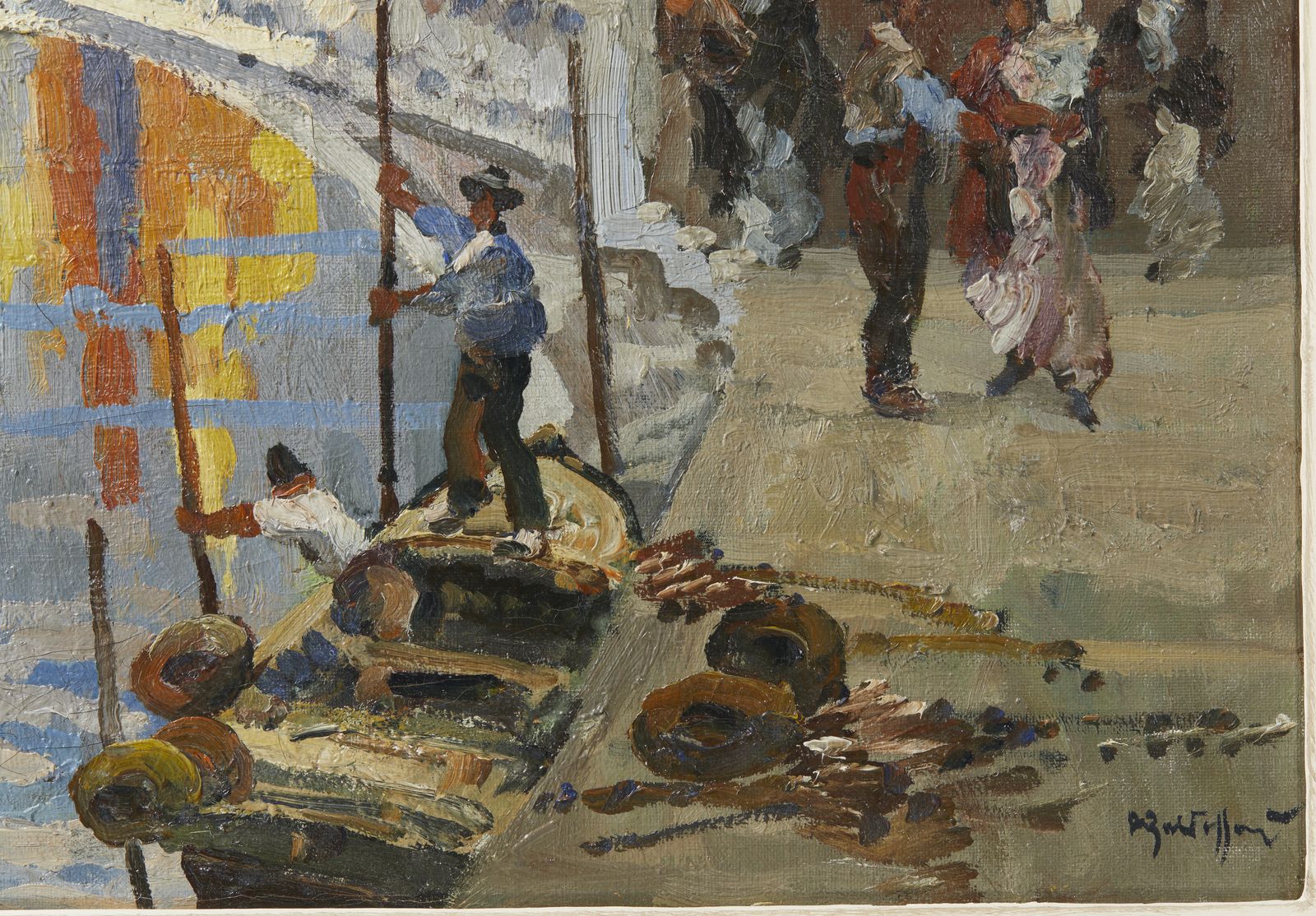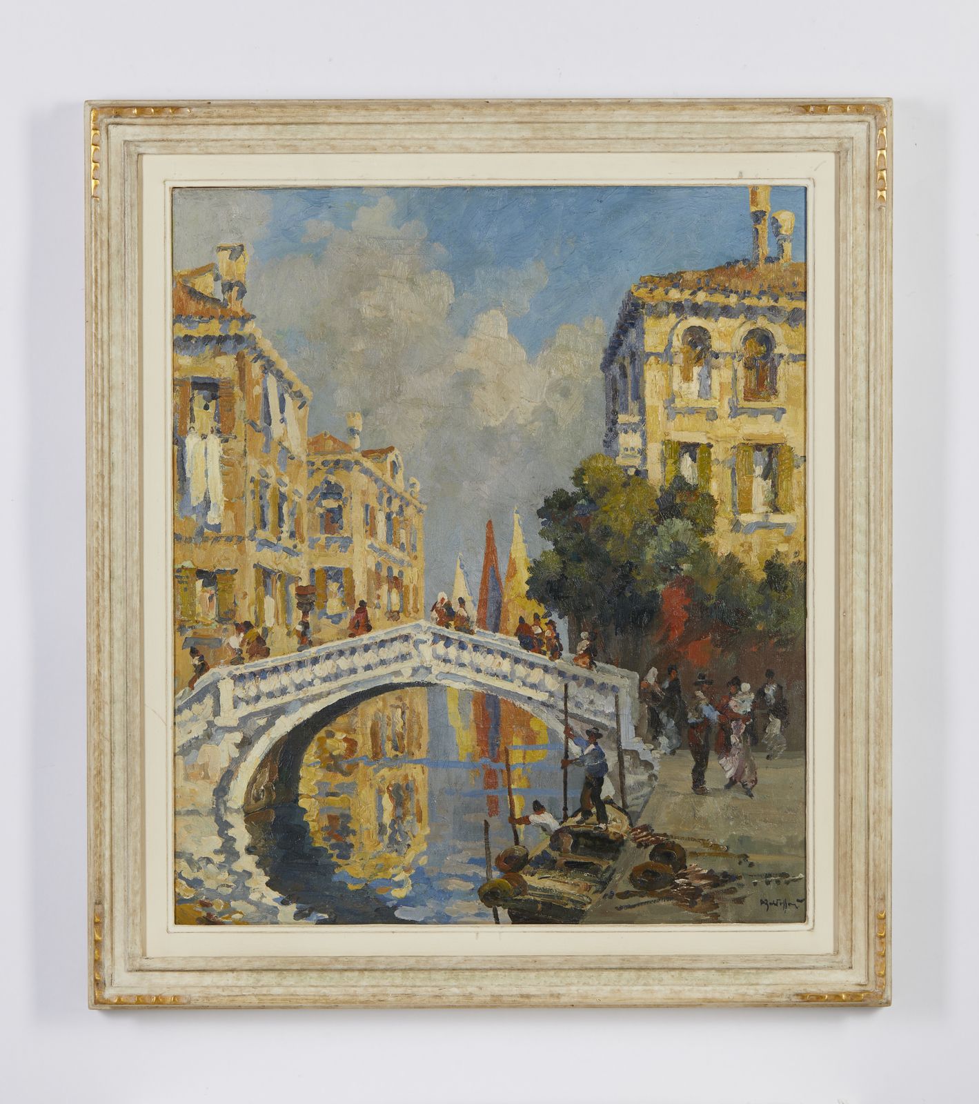 firmasul retro: frammento di etichetta Galerie [...], Hamburgl'opera accompagnata da certificato dell'archivio unico per il catalogo delle opere futuriste di Roberto Marcello Baldessari, a cura di Maurizio ScudieroPROVENIENZACollezione privata, Venezia''Si tratta di un tipico dipinto del periodo veneziano (cio pre-futurista).In esso sono evidenti le ascendenze al suo maestro, Beppe Ciardi, proprio nei termini della pastosit e della luminosit della materia pittorica, e non ultimo per l'uso delle velature. Sar su queste solide basi pittoriche che il Baldessari poi transiter nel Futurismo, dove si metter in luce in virt dell'alta qualit della sua pittura.Dai confronti stilistici effettuati l'opera pu essere ascritta tra la fine del 1913 ed i primi del 1914.'' M. Scudiero