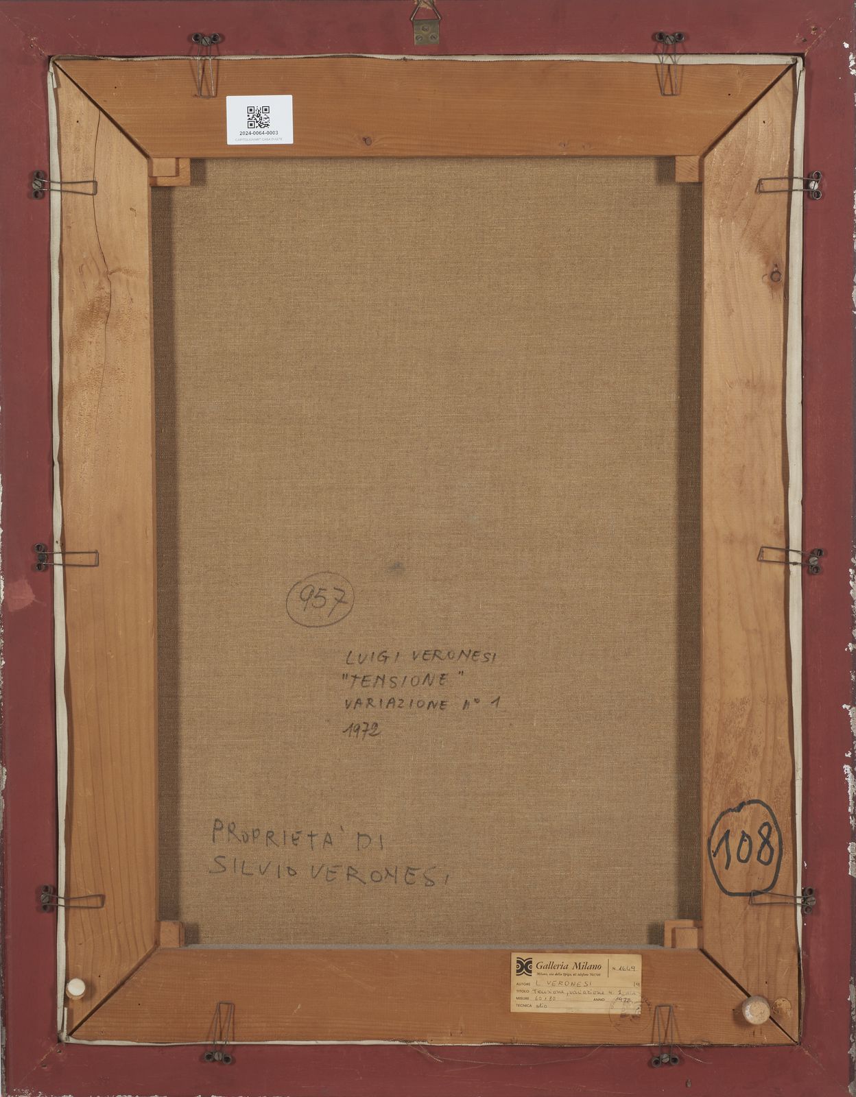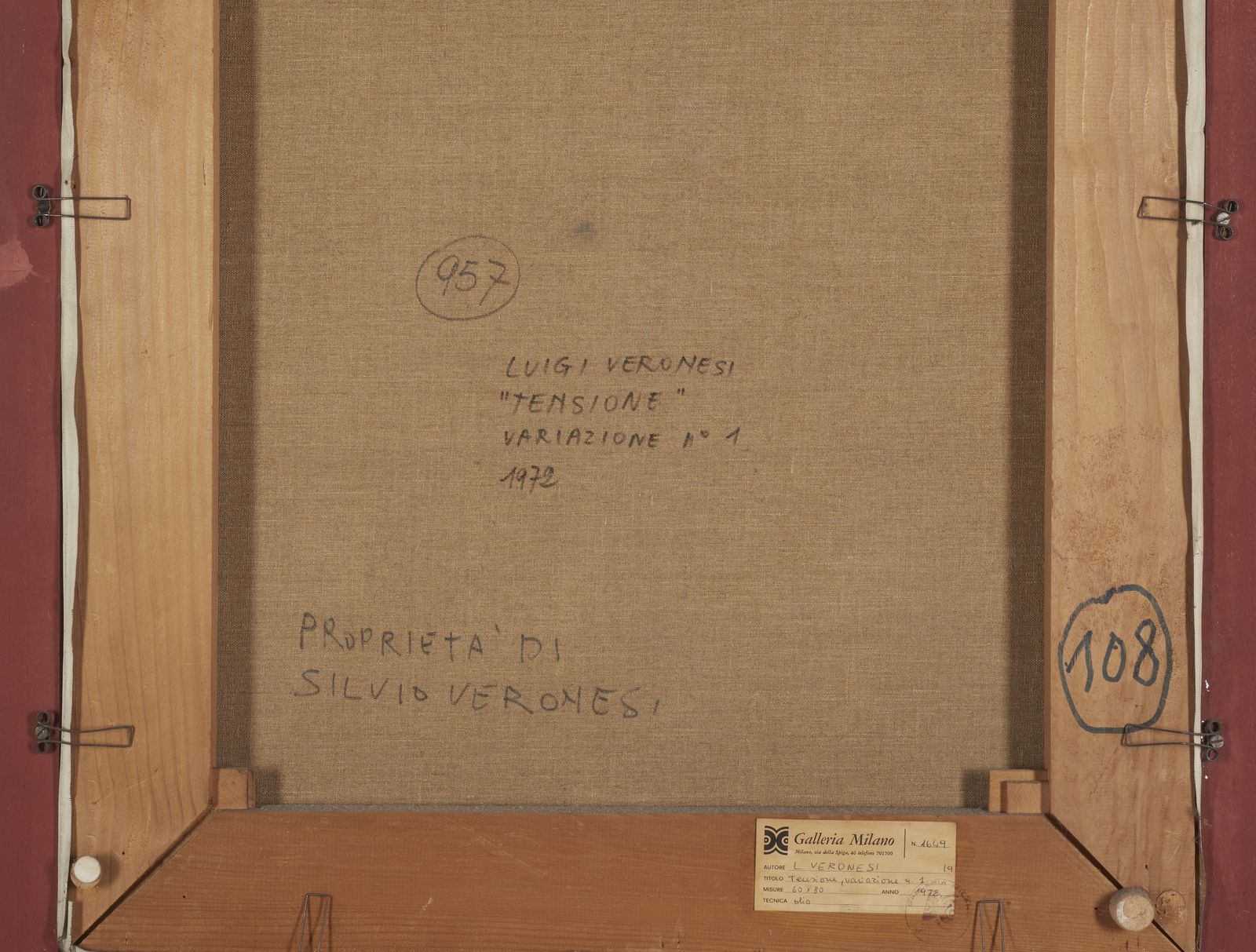firma e datasul retro: firma, titolo e data. etichetta Galleria Milano, MilanoPROVENIENZAOpera acquisita direttamente dall'artista dall'attuale proprietˆCollezione privata, Milano