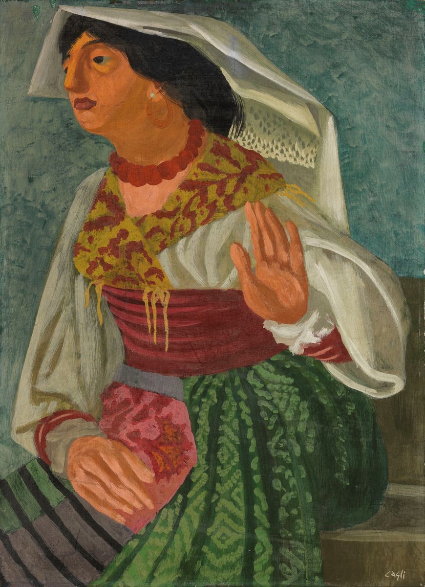 Tempera encaustica su compensato, cm. 70x50 (1934) Firma in basso a destra: Cagli. Al verso: cartiglio con dati dell'opera: due timbri e cartiglio Palma Studio d'Arte, Roma: dichiarazione di autenticità Opera originale del / Maestro Cagli / eseguita nel 1934 / in fede / Francesco / Muzzi.