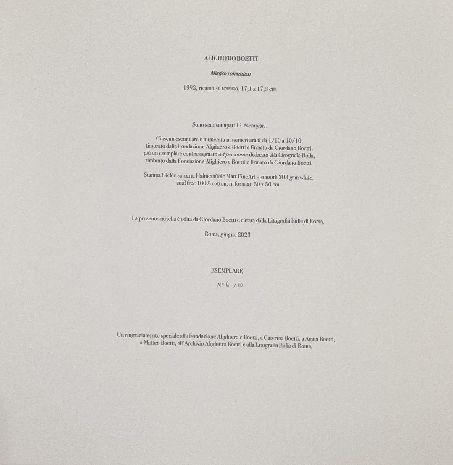 timbrato dalla Fondazione Alighiero e Boetti e firmato da Giordano Boetti, più un esemplare contrassegnato ad personam dedicato alla Litografia Bulla, timbrato dalla Fondazione Alighiero e Boetti e firmato da Giordano Boetti.