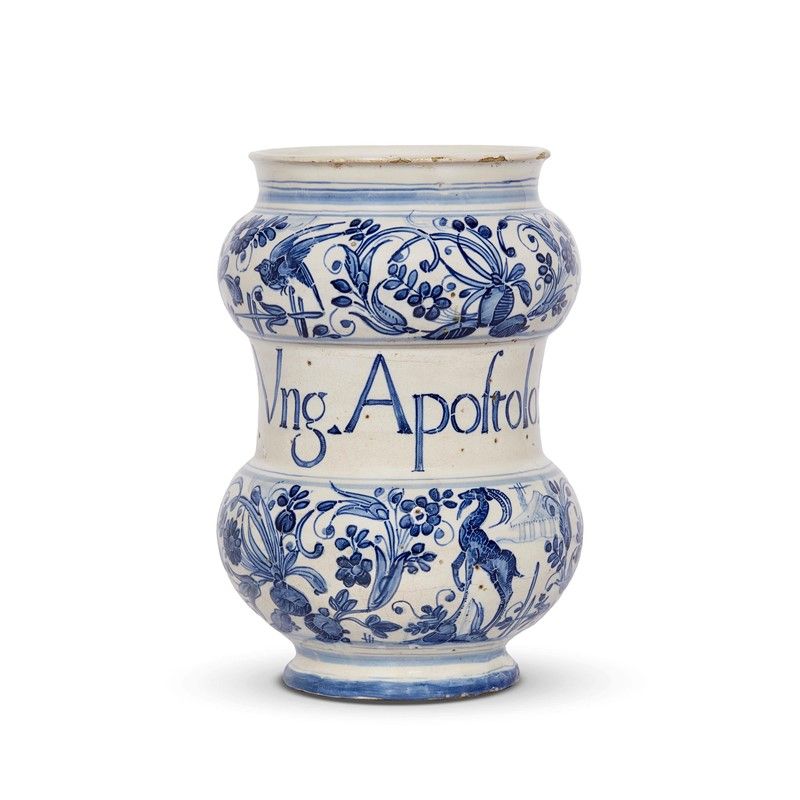 in maiolica monocroma, forma a rocchetto con ventre fortemente rastremato e spalla e base arrotondate, piede a disco, collo basso e cilindrico con orlo appena estroflesso. Il decoro a fasce con motivo “calligrafico naturalistico” mostra cervi e animali in un paesaggio, con vasto repertorio vegetale di derivazione orientale, e al centro cartiglio con scritta farmaceutica in caratteri corsivi delineata in blu. Il vaso trova riscontro in alcuni albarelli coerenti del Museo di Genova. Marca lanterna sul fondo; alt. cm 19,8, diam. bocca cm 11,2, diam. piede cm 8,7