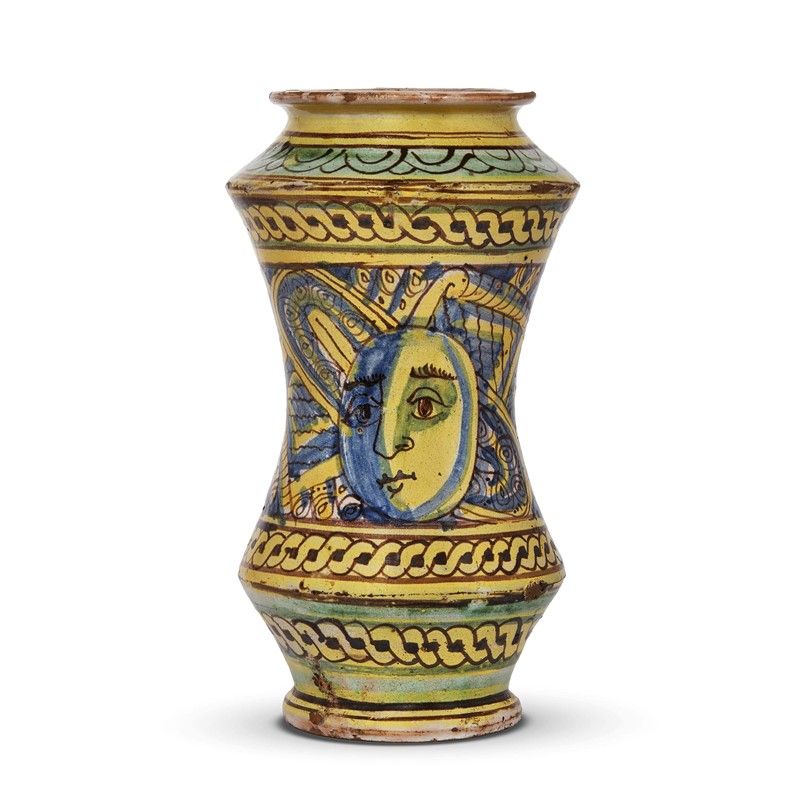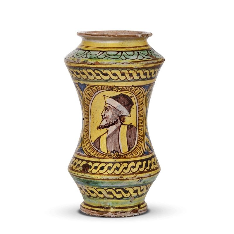 in maiolica dipinta in policromia, corpo di forma allungata e rastremata al centro con spalla e calice angolati. Sul fronte, entro un medaglione racchiuso in una cornice baccellata, è delineato un profilo virile su fondo giallo, delimitato sopra e sotto da una cornice a nastro continuo, mentre la restante superficie è occupata da un motivo continuo a trofei; alt. cm 25,5, diam. bocca cm 10,5, diam. piede cm 9,4