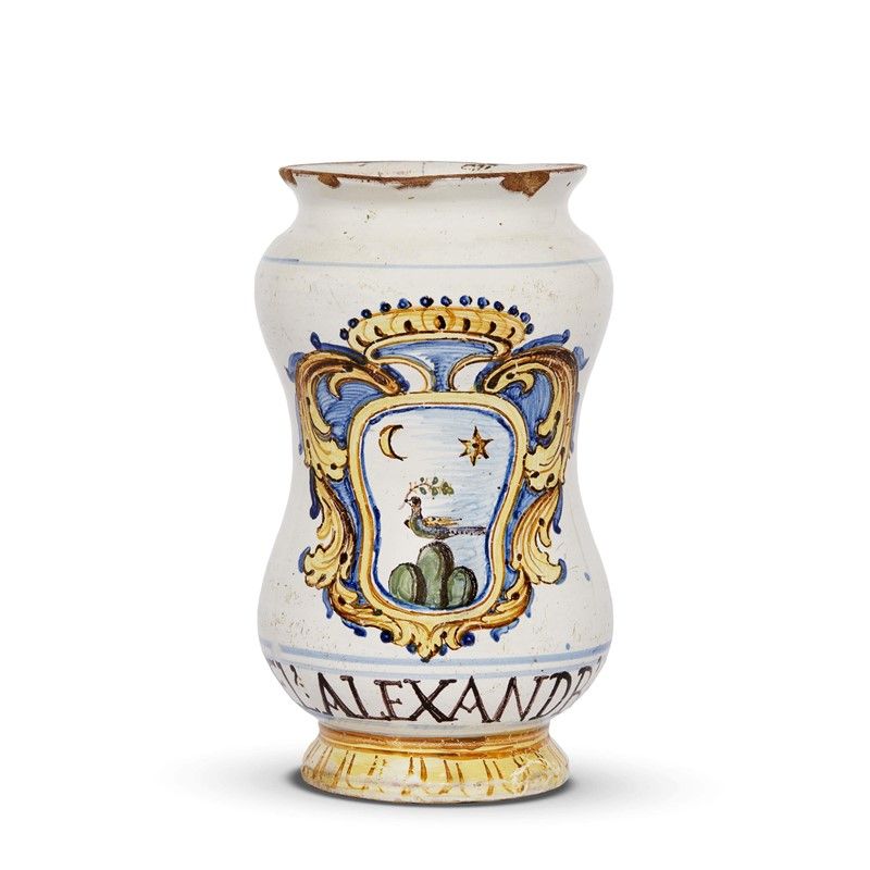 in maiolica dipinta in policromia, corpo a rocchetto leggermente rastremato al centro con piede carenato, la bocca con orlo estroflesso su collo breve, spalla e base arrotondate, piede piano. L’ornato occupa la parte anteriore con un emblema entro cornice a rocaille sormontato da corona e raffigurante un una colomba con un ramo d’ulivo nel becco appollaiata su un trimonte, e in alto il sole e la luna. Le modalità stilistiche sono quelle della produzione tardiva delle botteghe di Castelli d’Abruzzo, che ripropone le modalità compendiarie tra la fine del XVII secolo e i primi del secolo XVIII; alt. cm 17,8, diam. bocca cm 9, diam. piede cm 7,7