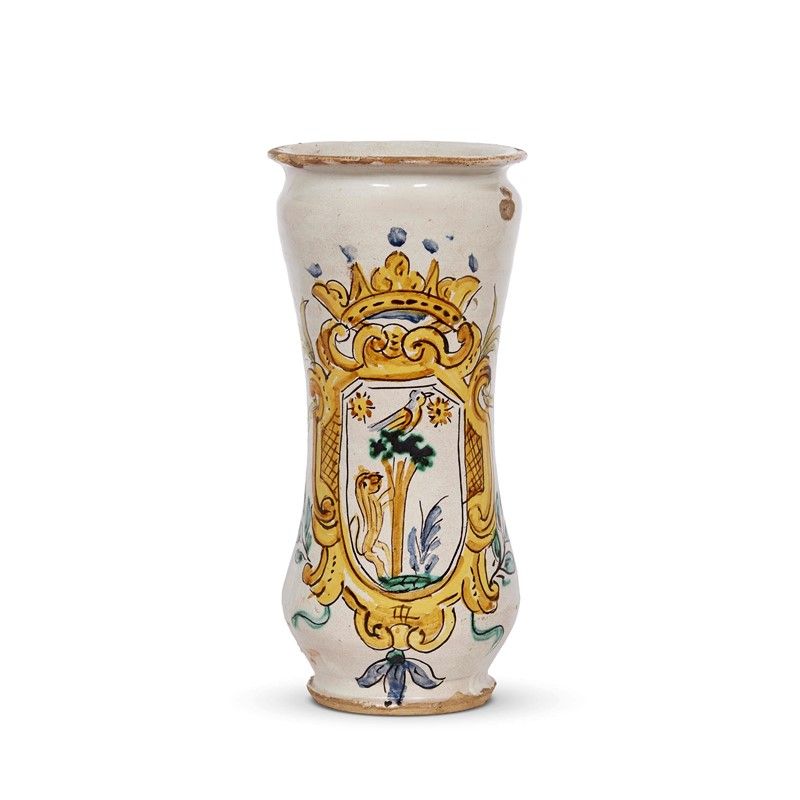 in maiolica dipinta in policromia, corpo cilindrico appena rastremata al centro, spalla e calice arrotondati, collo breve con orlo estroflesso tagliato a stecca, piede a disco a base piana. Il fronte mostra un emblema araldico con cornice sormontata da corona centrato da un leone rampante, una palma con un uccellino posato al di sopra e un cespuglio. Il vaso non trova al momento confronti precisi in letteratura, e tuttavia decori e opere morfologicamente simili si ritrovano soprattutto in area abruzzese tra la fine del XVII secolo e tutto il XVIII, come ad esempio un albarello con emblema con cane del Museo Capitolare di Atri; alt. cm 26,8, diam. bocca cm 12,3, diam. piede cm 9,2