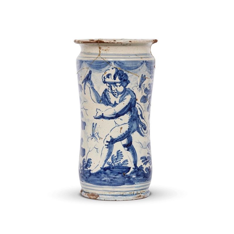 in maiolica policroma, corpo cilindrico poco rastremato al centro e dotato di spalla arrotondata poco pronunciata da cui si diparte un breve collo cilindrico con orlo estroflesso, piede basso su base piana. Il decoro, realizzato in monocromia blu su fondo a smalto stannifero bianco povero, vede al fronte un putto con un uccellino in una mano. Il vaso, datato sul retro 1726, s’inserisce a pieno nel gusto imperante nelle farmacie napoletane intorno al primo trentennio del Settecento. Nel nostro caso il pittore si distingue grazie alle sottili velature di colore presenti nel disegno, a dare corpo alla figura. La tradizione decorativa ammetteva la presenza di figure talvolta anche di grandi dimensioni, con un gusto istoriato, come ad esempio le figure rappresentate su alcuni albarelli della collezione Mazzacane al Museo della ceramica di Cerreto Sannita; alt. cm 21,8, diam. bocca cm 11,5, diam. piede cm 9,6