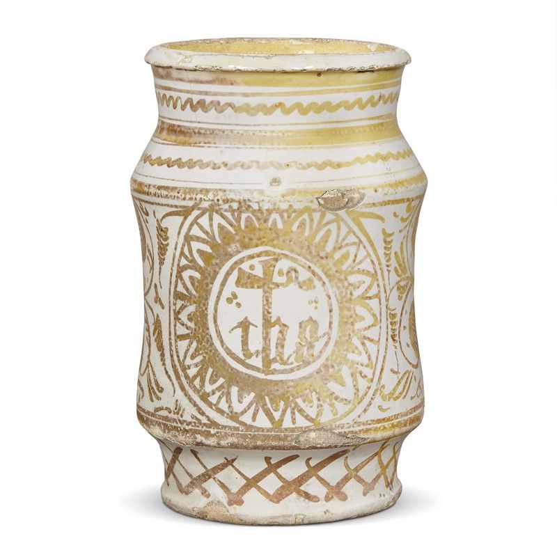 in maiolica decorata a lustro dorato, corpo di forma cilindrica appena rastremata al centro con spalla obliqua appena arrotondata, collo alto che si apre in una imboccatura rotonda con orlo arrotondato tagliato a stecca, calice breve e angolato che scende su piede cilindrico a base piana. Il decoro a lustro dorato su fondo maiolicato bianco mostra al centro della composizione il trigramma IHS di San Bernardino entro un medaglione con cornice a raggera con punte lanceolate, e tutto intorno un fitto decoro a motivi fitomorfi. L’albarello s’ispira alle maioliche di Manises, dalle quali prende spunto soprattutto la decorazione a piccole fogliette, ma non trova in quella manifattura riscontri precisi, che ci sono invece con la produzione tardo quattrocentesca dei lustri prodotti nelle fornaci umbre di Deruta, di cui sono stati recentemente pubblicati le documentazioni di scavo, pertinenti in particolare al motivo a dente di lupo che circonda il trigramma; alt. cm 22,5, diam. bocca cm 13, diam. piede cm 11,6
