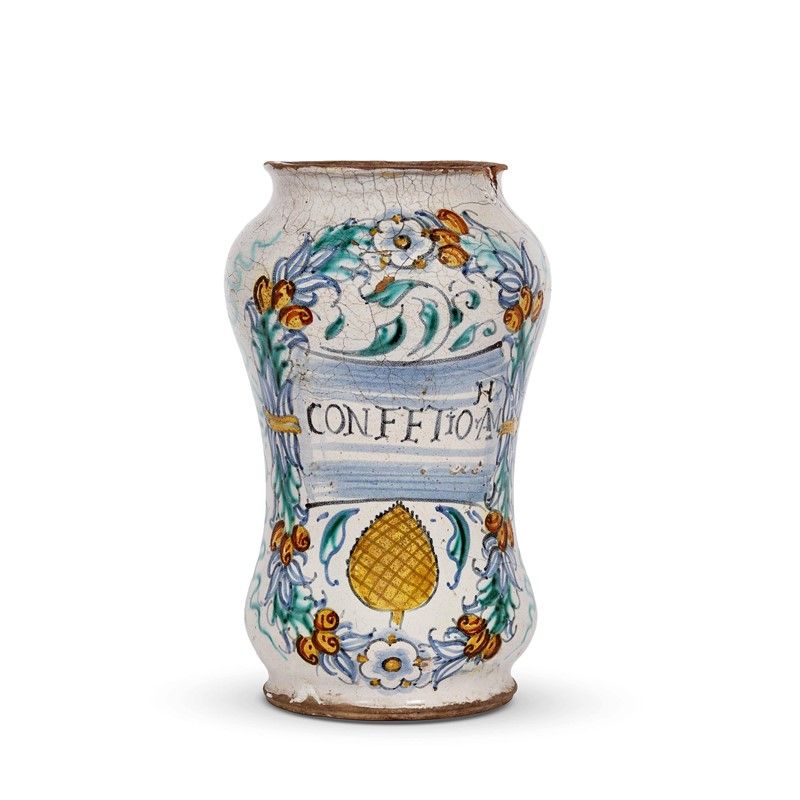 in maiolica dipinta in policromia, corpo cilindrico fortemente rastremato al centro, imboccatura con orlo estroflesso dal profilo sottile, collo breve su una spalla rigonfia e arrotondata e piede basso dall’orlo tagliato a stecca e poggiante su una base piana. Il decoro interessa la parte frontale con una ghirlanda a festone fogliato e fruttini, centrato da due fiori, a circondare un cartiglio rettangolare con scritta farmaceutica in lettere capitali, sotto al quale è dipinto un emblema farmaceutico con una pigna tra due sottigli foglie allungate; sul retro nastri verde-acqua svolazzanti. Il vaso trova riscontri nella produzione umbro-laziale della fine del Cinquecento, ed in particolare nella città di Deruta, dove tale genere è stato prodotto con decori più o meno accurati e molto diversificati; alt. cm 22,7, diam. bocca cm 10,2, diam. piede cm 11,7
