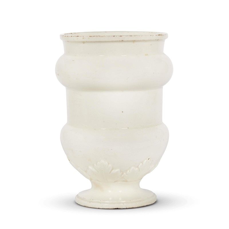in terraglia acroma, corpo a rocchetto con ventre marcato su alto piede a calice rastremato verso il basso con una decorazione a foglie di vite a rilievo, spalla rigonfia e orlo tagliato a stecca su breve collo cilindrico. Il vaso è lasciato privo di decoro secondo la moda della terraglia “ad uso di Inghilterra”, moda che aveva ormai preso in Italia e nelle manifatture pesaresi tra la fine del XVIII e l’inizio del XIX secolo, come ad esempio le fabbriche Benucci e Latti e le altre minori attive nella città marchigiana in quegli anni; alt. cm 17,5, diam. bocca cm 11,4, diam. piede cm 7,2